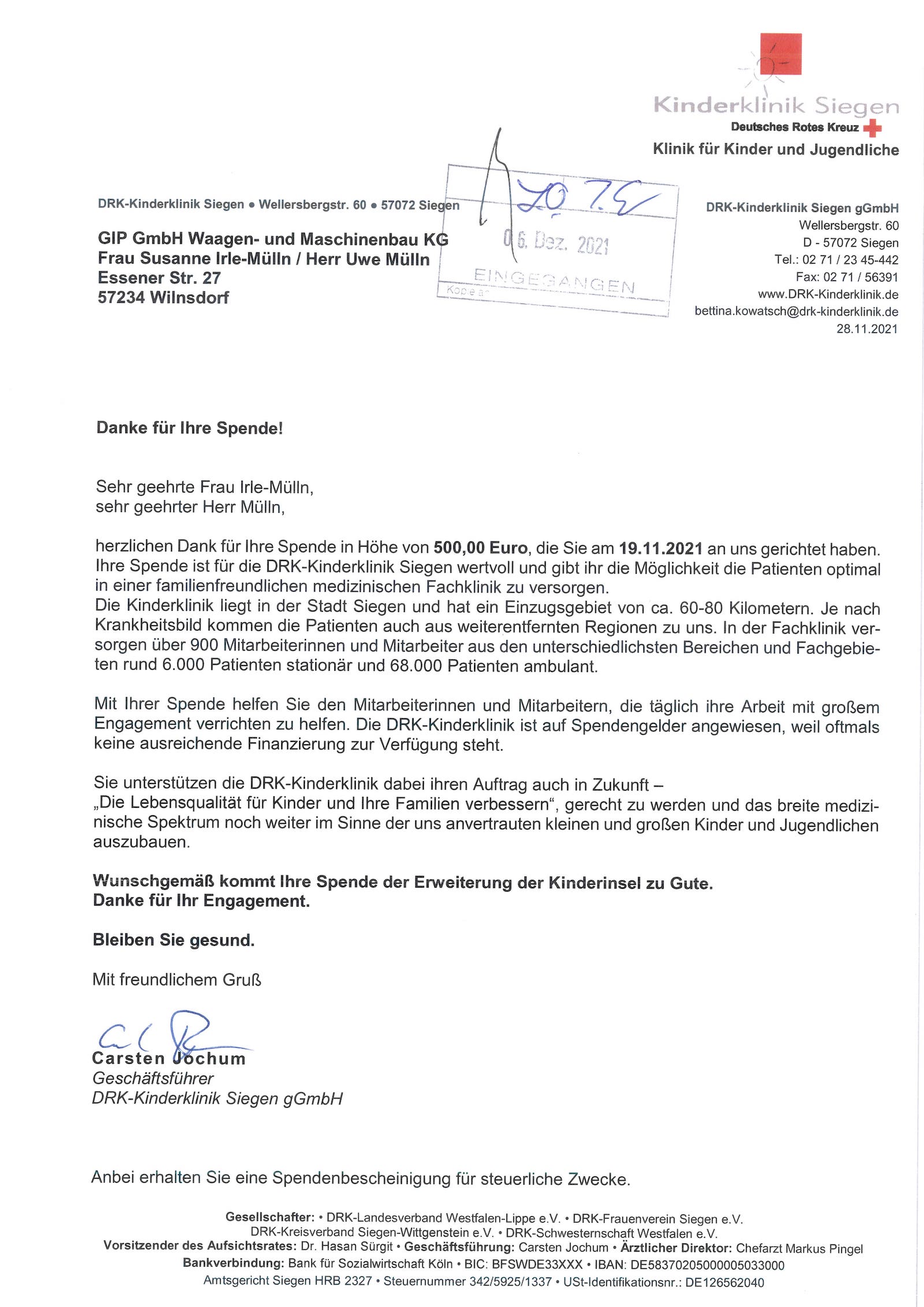 Deswegen spenden wir dieses Jahr 500 € an die DRK-Kinderklinik in Siegen. Das Geld soll der Erweiterung der Kinderinsel, einer speziellen Intensivstation mit Wohncharakter, zu Gute kommen.